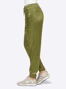 Cargohose Relaxter Jogpant-Style. Mit Rundumdehnbund, aufgesetzten Eingrifftaschen und Tunnelzug mit Bindeband. Am Saumabschluss mit Gummizug. Modisch glänzende Ware. Normale Leibhöhe. Comfort Fit. Fußweite ca. 28 cm. 98% Polyester, 2% Elasthan. Maschinenwäsche.