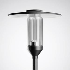 Dekorative LED-Laterne für Mastaufsatzmontage. Mit autarker Leistungsreduzierung über integrierte Auswerteelektronik. Reduzierung des Leuchtenlichtstroms auf 50 % für einen Zeitraum von 7 Stunden (-2h/+5h). Der Mittelpunkt der Einschaltdauer wird täglich neu bestimmt.. Für Mastzopf Ø 76 mm. Mittels separat zu bestellender Reduzierstücke auch zur Montage an Masten mit Zopf Ø 60 mm geeignet. Optisches System in Multi-Lens-Technologie (MLT) ausgeführt. Leuchtenoptik bestehend aus hocheffizienten, UV- und temperaturbeständigen Linsensystemen. Mit asymmetrisch breit strahlender Lichtstärkeverteilung. Zur Beleuchtung von Straßen nach P-Beleuchtungsklassen. Zur flexiblen Anpassung an kundenspezifische Beleuchtungsaufgaben stehen weitere Abstrahlcharakteristiken zur Verfügung. Der nachträgliche Einbau einer rückseitigen / seitlichen Abschirmung ist als separat zu bestellendes Zubehör möglich. LED-System bestehend aus 2 LED-Modulen. Bemessungslichtstrom 1500 lm, Bemessungsleistung 13,50 W, Leuchten-Lichtausbeute 111 lm/W. Lichtfarbe warmweiß, ähnlichste Farbtemperatur (CCT) 3000 K, allgemeiner Farbwiedergabeindex (CRI) Ra größer als 70. Farborttoleranz (initial MacAdam) = 5 SDCM, Weitere LED-Lichtfarben auf Anfrage verfügbar. Mittlere Bemessungslebensdauer LCLO(tq 25 °C) = 100.000 h. Ausführungen mit 3-Stufen-Schalter zur Einstellung unterschiedlicher Lichtströme auf Anfrage. Leuchtenkörper aus Aluminium-Druckguss, Leuchtendach aus korrosionsbeständigem Alum