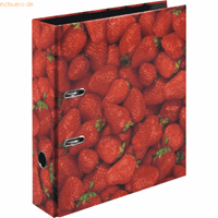 Ordner maX.file; Material der Kaschierung außen/innen: Bilderdruckpapier cellophaniert/Papier schwarz; Qualitäts-Hebelmechanik mit extremer Zuhaltekraft, Roter Gummitip am Hebelende der Mechanik, Niederhalter mit erhöhter Klemmkraft und eingearbeitetem rotem Logo; S80; Hebelmechanik; Griffloch vorhanden; Schlitze vorhanden; Verwendung für Papierformate: A4; Größe (B x H): 285 x 318 mm; Breite des Rückens: 80 mm; Farbe/Farbe des Rückens: Motiv Erdbeeren/Motiv Erdbeeren; Zertifikate und Zulassungen: Forest Stewardship Council (FSC), LGA-Qualitätszertifikat;