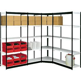 Minutenschneller Aufbau durch modernes Stecksystem und optimale Raumnutzung durch Eckregale und die Kombination von 1000 und 750 mm breiten Regalfeldern. Alle Regale in 3 Hoehen und 4 Tiefen, wahlweise auch mit Rueckwaenden sowie mit Seitenblenden fuer Regalanfang und Regalende. Regalpfosten aus Kastenprofilen mit glatten Fronten. Details:Fachboeden mit 40 mm hoher Sicherheitskante und im Raster von 59 mm hoehenverstellbar. Tragkraft pro Fachboden 100 kg. Alle Teile mit hochwertiger Polyester-Pulverbeschichtung, Farbkombination schwarz RAL 9011, lichtgrau RAL 7035. Breite pro Regalwand = Nennbreite + 30 mm.Fachlast (Tragkraft pro Fachboden) . . 100 kg Feldlast (Tragkraft pro Regalfeld). . . .600 kg bei gleichmaessig verteilter Last