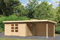 Das Blockbohlenhaus wird aus 40 mm starken Wandbohlen aus nordischer Fichte in klassischer Bockbohlenbauweise gefertigt und gewährleistet somit einen einfachen Aufbau und eine sehr stabile Konstruktion. Bei dieser Bauweise werden die Wandbohlen reihum aufgestapelt, beginnend mit einer halben Bohle für eine glatte und stabile Auflage, und dann miteinander verschraubt. Unsere patentierte 6-Plus-Eckverbindung garantiert eine sehr hohe Regen- und Winddichte. Durch die Doppelnut und -feder sind die Wände extrem stabil. Die in den Eckverbindungen sitzenden Vorbohrungen für die Verschraubung der Blockbohlen sind werkseitig vorgefertigt und verkürzen die Montage enorm. Das Pultdach besteht aus Massivholzdach, sodass das Gartenhaus rasch gegen von oben kommende Witterungseinflüsse geschützt ist. Der vordere Dachüberstand von 270 cm schützt den Eingangsbereich darüber hinaus wirkungsvoll. Die Grundfläche beträgt 11,5 qm bei einem umbauten Raum von 21 cbm. Mit einer Seitenhöhe von 196 cm und einer Firsthöhe von 217 cm bietet das Gerätehaus optimale Raumnutzung. Das Gartenhaus ohne Anbauten hat ein Sockelmaß von 372 cm x 282 cm. Bei den Blockbohlenhäusern kommt hierzu noch das Maß der überstehenden Blockbohlenköpfe. Bodenbalken sorgen für den Schutz von unten und werden unter das Gartenhaus gelegt. Durch die Kesseldruckimprägnierung der Bodenbalken sind diese vor Witterungseinflüssen und holzzersetzenden Pilzen bereits geschützt. Die praktische und vormontierte Tür sorgt mit Ihren großzügigen Abmessungen und dem Massivholzrahmen für einen einfachen Zutritt in das Gartenhaus und sichert den Inhalt nebenbei effektiv vor unbefugtem Zugriff. Die Verglasung der Lichtausschnitte sorgt für großzügigen Tageslichteinfall.