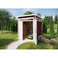 21 mm Wandstärke, 16 mm starker Massivholzboden, 16 mm starkes Massivholz-Flachdach, Oberlichter an allen vier Seiten, außen doppelt aufgetragene Wetterschutzfarbe in schwedenrot; Das rote Massivholzgartenhaus ist mit einem Flachdach und einer Massivholz-Doppeltür ausgestattet. Es besitzt ein langes Fensterpanel in der Front und je ein Fensterpanel in den Seitenwänden, sowie in der Rückwand.