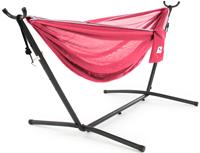 Fröhliche brasilianische Hängematte und Standard für jeden Garten Lehnen Sie sich zurück und entspannen Sie sich mit dieser außergewöhnlich leichten Kombination. Dank der integrierten Aufbewahrungstasche und der praktischen Tragetasche der Hängematte, die im Stand enthalten sind, können Sie die langlebige Netzhängematte von Vivere überall hin mitnehmen und aufstellen, wo immer Sie möchten. Der 250-cm-Ständer ist so einfach zu montieren, dass Sie kein zweites Paar Hände benötigen. Sie können innerhalb von Minuten bequem sitzen.