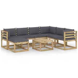 Dieses Gartenmöbel-Loungeset ist die ideale Wahl, um sich zu entspannen und das Wetter zu genießen, ein Nickerchen zu machen oder mit Ihrer Familie oder Freunden zu plaudern. Mit seinem zeitlosen Paletten-Design verleiht das Sofa-Set aus Holz Ihrer Terrasse, Ihrem Garten oder Ihrem Wohnzimmer einen Hauch von rustikalem Charme. Aus imprägniertem Kiefernholz gefertigt, ist das Paletten-Lounge-Set langlebig, witterungsbeständig und umweltfreundlich. Dieses Gartensofa-Set hat eine solide Konstruktion und erfordert wenig Wartung. Kombiniert mit dick gepolsterten Kissen bietet die Sofagarnitur höchsten Komfort. Darüber hinaus lässt sich das Set dank seines modularen Designs in einer beliebigen Anordnung je nach Belieben aufzustellen. Hinweis: Um die Lebensdauer Ihrer Gartenmöbel zu verlängern, empfehlen wir Ihnen, diese regelmäßig zu reinigen und bei Nichtgebrauch im Freien abzudecken.Reinigung: Verwenden Sie eine milde Seifenlösung.Lagerung: Wenn möglich, an einem kühlen, trockenen Ort im Innenbereich lagern. Wenn das Produkt im Freien gelagert wird, schützen Sie es mit einer wasserdichten Abdeckung. Wischen und trocknen Sie das überschüssige Wasser oder den Schnee nach Regen oder Schneefall von ebenen Flächen. Sorgen Sie für eine ausreichende Luftzirkulation, um feuchtigkeitsbedingte Schäden zu vermeiden.Artikelmerkmale:Kissen-Farbe: AnthrazitMaterial: Kiefernholz, grün imprägniertKissen-Material: Stoff (100% Polyester)Abmessungen des Ecksofas: 64 x 64 x 70 cm (B x T x H)Abmessungen des Mittelsofas: 60 x 64 x 70 cm (B x T x H)Abmessungen des Tisches / Hockers: 60 x 60 x 36,5 cm (B x T x H)Sitzkissen-Dicke: 6 cmRücken-/Seitenkissen-Dicke: 13 cmZusammenbau erforderlich: JaLieferung enthält:3 x Sofa-Eckteil3 x Sofa-Mittelteil2 x Tisch/Fußhocker7 x Sitzpolster9 x Rücken-/Seitenkissen