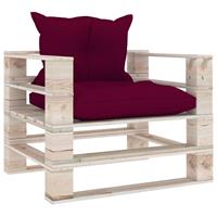 Dieses trendige Garten-Palettensofa ist die ideale Wahl, um sich zu entspannen und das Wetter zu genießen, ein Nickerchen zu machen oder mit Ihrer Familie oder Freunden zu plaudern. Mit einem zeitlosen Palettendesign verleiht dieser Holz-Sessel Ihrer Terrasse, Ihrem Garten oder Ihrem Wohnzimmer einen Hauch von rustikalem Charme. Das Gartensofa besteht aus hochwertigem Kiefernholz und ist somit langlebig, wetterbeständig und umweltfreundlich. Dieses Terrassensofa hat eine solide Konstruktion und erfordert wenig Wartung. Dieser Sessel wird mit weichen, dick gepolsterten Kissen geliefert und bietet höchsten Komfort. Sie können die Sonne genießen, ein Nickerchen machen oder auf dem Sofa plaudern. Bitte beachten Sie: Holz ist ein Naturprodukt und kann leichte Unvollkommenheiten aufweisen. Spezifikationen: Polsterfarbe: Weinrot Material: Imprägniertes Kiefernholz, Stoff (100% Polyester) Gesamtabmessungen: 80 x 67,5 x 62 cm (B x T x H) Sitzpolster-Dicke: 10 cm Rückenpolster-Stärke: 13 cm