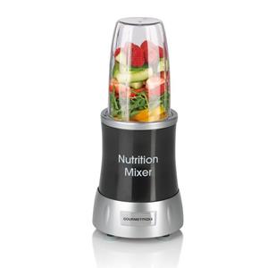 GOURMETmaxx Nutrition Mixer Deluxe 11-tlg. Edelstahl/schwarz 1 Küchenmaschine =, 7 Funktionen Hacken, Mixen, Mischen, Pürieren, Zerkleinern, Mahlen, Aufbewahren Ideal auch für Cocktails, Dips u.v.m. Mit praktischem To-go-Deckel – ideal auch für unterwegs Frische Smoothies schmecken nicht nur köstlich, sondern liegen auch voll im Trend und sind ein echtes „Muss“ für alle, die auf Fitness und Gesundheit achten. Genießen Sie jetzt jeden Tag Ihren persönlichen Vitamin-Mix! Mit dem Mr. Magic Nutrition Mixer können Sie nicht nur gesunde Smoothies, sondern auch Cocktails, Milchshakes, Desserts, Soßen und Dips sowie viele andere Speisen und Drinks in Minutenschnelle zubereiten. Der Fantasie beim Mixen und Mischen sind keine Grenzen gesetzt, denn dieses flinke Küchengerät mixt, rührt, zerkleinert, mahlt, hackt, schlägt und püriert ganz nach Ihren Wünschen. Dank der turboschnellen, extra scharfen Klingen ist alles blitzschnell erledigt – so brauchen Sie auch bei Zeitmangel nicht auf wertvolle Vitamine und Nährstoffe zu verzichten. Gönnen Sie sich den fruchtig-frischen Smoothie-Genuss sogar zum Mitnehmen, denn der Mr. Magic Nutrition Mixer liefert Ihnen nicht nur einen praktischen Becher mit Deckel zum Aufbewahren, sondern auch noch den praktischen To-go-Deckel gleich mit! Alle abnehmbaren Teile (bis auf die Klingenaufsätze) sind spülmaschinengeeignet. Details: - Maße ca. (L x B x H): ca. 15 x 15 x 19 cm - Material: ABS, PP, AS, Silikon, Edelstahl - Leistung: 230 V, 50 Hz, 1000 W Im Set enthalten: 1 x Motoreinheit, 1 x Mixbecher 700 ml mit Kreuzklingenaufsatz und Flachklingenaufsatz, 2 Mixbecher 350 ml, 1 x To-go-Deckel, 1 x Streudeckel, 2 x Frischhaltedeckel, 1 Gratis-Rezeptheft