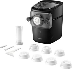 Die Philips 7000 series Nudelmaschine HR2665/93 ermöglicht die einfache und schnelle Zubereitung von hausgemachter Pasta. Dank ihrer ProExtrude-Technologie zaubert sie einen elastischen und glatten Teig. Für geschmeidige Ergebnisse besitzt das Gerät eine starke Metallscheibe sowie einen stabilen Metallrührstab. Ausgestattet ist es zudem mit mehreren Formaufsätzen für verschiedene Nudelarten. Nach den persönlichen Vorlieben lassen sich beispielsweise Penne, Tagliatelle oder Fettucine zubereiten. Insgesamt hat die Nudelmaschine ein Fassungsvermögen für bis zu acht Portionen. Durch ihr leicht zu reinigendes Design kann sie mühelos sauber gemacht werden.
