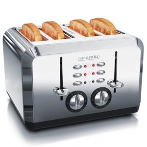 Der Arendo BREAKFAST X2: Der 4-Scheiben-Toaster für die ganze Familie Wenn der BREKFAST X2-Toaster in Aktion tritt, können Freunde und Familie ihre Toasts gemeinsam genießen. Mit seinen vier Fächern wirft der BREAKFAST in gleicher Zeit doppelt so viele Toasts aus wie ein Standardgerät. Wenn Toasts überbleiben, kein Problem: Einfach mit der Aufwärmfunktion wieder warm und knusprig werden lassen. Mit seinem Edelstahlgehäuse und den chromfarbenen Bedienelementen im Retro-Stil weiß der BREAKFAST X2 auch optisch zu begeistern. Produktvorteile: 4-Schlitz/4 Scheiben-Toaster mit zwei separaten Rösteinheiten Extrabreite Röstschlitze (für American Toast geeignet) automatische Brotscheibenzentrierung Bräunungsstufen von 1-6 Auftau-, Aufwärm- und Stopp-Funktion Leichte Reinigung durch zwei herausnehmbare Krümelschubladen Gummifüße (Anti-Rutsch) 2x 3 Tasten (CANCEL/ REHEAT/ DEFROST) mit Status-LED (rot) Integrierte Kabelaufwicklung Gehäuse besteht aus hochwertigem EdelstahlAbmessungen: L (26 cm) T (28,5 cm) H (19 cm) | Netzkabel-Länge: ca. 1,2 m Gewicht: 2146 g | Material: EdelstahlLieferumfang: Arendo BREAKFAST X2 Edelstahl 4-Scheiben-Toaster +, Bedienungsanleitung (GER) Technische Daten: Leistungsaufnahme: 1370-1630 W (nur ca. 710 W je Rösteinheit) Spannungsversorgung: 220-240V 50/60 Hz Steckertyp: Schuko Typ F CEE 7/7 Netzkabel-Länge: ca. 1,2 m / Kabeldurchmesser: 6 mm Gewicht: 2146 g Material: Edelstahl