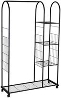 Mobil und flexibel: Mit dem praktischen Garderoben-Kleiderständer ist für Ordnung in Ankleide- oder Schlafzimmer gesorgt. Dank drei Regalböden, einer geräumigen Schuhablage und der Kleiderstange bietet der Ordnungshelfer reichlich Platz und eine gute Übersicht über gefaltete und hängende Textilien. Die seitliche Gitterstruktur schafft zusätzliche Aufbewahrungsmöglichkeiten für Schals, Socken, Schmuck, aber auch Bügel und Hängekörbchen. Gut organisiert: Zum Bereitlegen täglicher Arbeitsoutfits eignet sich das Möbelstück ebenfalls hervorragend. Da es über Rollen verfügt, lässt es sich bequem von einem Ort zum anderen verschieben und dort mittels Feststellbremsen abstellen. Die Garderobe besteht aus pulverbeschichtetem Stahlrohr in der Farbe Schwarz und verfügt oben über formschön abgerundete Streben – ein nützlicher Allrounder für die Kleidersortierung.
