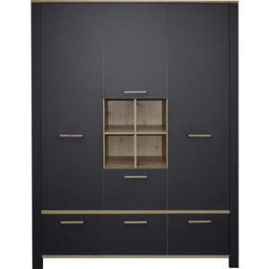Farbe: Farbe: anthrazit, Farbe Korpus: anthrazit, Farbe Griffe: Holzfarben, Farbe Füße: anthrazit, Farbhinweise: Bitte beachten Sie, dass bei Online-Bildern der Artikel die Farben auf dem heimischen Monitor von den Originalfarbtönen abweichen können., Ausstattung & Funktionen: Anzahl Einlegeböden: 5, Anzahl Kleiderstangen: 1, Anzahl Kleiderstangen klein: 2, Anzahl Schubladen: 4 St., Anzahl Schubladen klein: 4, Anzahl Türen: 3 St., Art Einlegeböden: teilweise variabel einsetzbar, Art Griffe: Stangengriff, Art Inneneinteilung: Basisausführung, Art Türen: Drehtüren, Maßangaben: Breite: 160 cm, Tiefe: 50 cm, Höhe: 195 cm, Gewicht: 136 kg, Belastbarkeit maximal: 67 kg, Länge Kleiderstangen: 46 cm, Länge Kleiderstangen klein: 43,5 cm, Stärke Einlegeböden: 1,5 cm, Belastbarkeit Einlegeböden maximal: 5 kg, Breite Fachinnenmaß: 22 cm, Tiefe Fachinnenmaß: 41 cm, Höhe Fachinnenmaß: 24 cm, Breite Fachinnenmaß 2: 46 cm, Tiefe Fachinnenmaß 2: 42 cm, Höhe Fachinnenmaß 2: 113 cm, Breite Fachinnenmaß 3: 46 cm, Tiefe Fachinnenmaß 3: 42 cm, Höhe Fachinnenmaß 3: 32 cm, Breite Fachinnenmaß 4: 46 cm, Höhe Fachinnenmaß 4: 42 cm, Breite Fachinnenmaß 5: 36 cm, Breite Schubladeninnenmaß: 42 cm, Tiefe Schubladeninnenmaß: 33 cm, Höhe Schubladeninnenmaß: 21 cm, Hinweis Maßangaben: Alle Angaben sind ca.-Maße., Material: Material: Holzwerkstoff, Material Korpus: Holzwerkstoff, Material Einlegeböden: Holzwerkstoff, Material Türen: Holzwerkstoff, Material Schublade: Holzwerkstoff, Material Schubladenauszug: Metall, Material Auszüge: Metall, Material Kleiderstangen: Aluminium, Material Griffe: Metall, Material Oberboden: Holzwerkstoff, Material Beschläge: Metall, Material Rückwand: Hartfaserplatte, Material Scharniere: Metall, Material Füße: Holzwerkstoff, Material Einlegeböden: Holzwerkstoff, Optik/Stil: Oberflächenbeschichtung: melaminbeschichtet, Oberflächenoptik: matt, Oberflächenoptik Front: matt, Oberflächenoptik Korpus: matt, Lieferung & Montage: Lieferzustand: zerlegt, Montagehinweis: Bitte beachten Sie, dass zur Montage links, rechts und oben jeweils ca 25 cm Platz zusätzlich benötigt wird, Anzahl Packstücke: 4, Aufbauhinweise: inklusive Aufbauanleitung - eine zweite Person zum Aufbau wird empfohlen, Hinweise: Zubehörartikel: 31264611, 86727457, 88246448, 31440818, 32657923, Pflegehinweise: feucht abwischbar