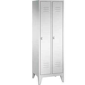 CLASSIC Aufbewahrungsschrank mit Füßen, 2 Abteile, Abteilbreite 300 mm, lichtgrau. Anlieferung = montiert. Höhe = 1850 mm. Tiefe = 500 mm. Breite = 610 mm. Korpusfarbe = lichtgrau RAL 7035. Türfarbe = lichtgrau RAL 7035. Verschlussart = Drehriegel mit Vorrichtung für Vorhängeschloss. Anzahl Abteile = 2 Stück. Anzahl Fächer = 2 Stück. Abteilbreite = 300 mm. Material = Stahlblech. Abteilhöhe = 1850 mm. Innenausstattung = je Abteil: 4 Einlegeböden. Innenbreite = 230 mm. Innentiefe = 465 mm. Türart = Flügeltür. Fachbreite = 300 mm. Fachtiefe = 500 mm. Fußhöhe = 150 mm. Konstruktion = verschweißt. Oberfläche = lackiert. Langlebige Stahlkonstruktion. 110° Türöffnungswinkel. Korpus aus stabiler Stahlkonstruktion mit hochwertiger Einbrennbeschichtung, innen 4 fest eingebaute Einlegeböden je Abteil. Schrankboden hinten mit Lüftungsöffnungen für optimale Luftzirkulation, auf 150 mm hohen Füßen aus Kunststoff. Drehriegel für Vorhängeschlösser, Türen mit Anschlagsdämpfer und mittiger Verstärkung für hohe Stabilität, mit Lüftungsschlitzen oben und unten sowie eingestanztem Etikettenrahmen, Türaufhängung in Drehbolzen. Montierte Anlieferung. Pfand- oder Kassierschlösser auf Anfrage erhältlich.