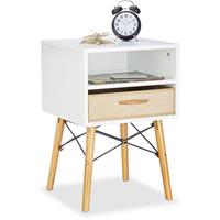 Der kleine Nachttisch in weiß passt hervorragend neben Ihr Bett. Die Ablage ist praktisch um Brille, Taschentücher und Handy griffbereit zu haben. Sie bietet außerdem genug Platz für eine Nachttischlampe, ein kleines Radio oder den verhassten Wecker. Die offenen Fächer können Sie für Ihre Nachtlektüre oder Kleidung nutzen, die Sie nicht in Ihrem Kleiderschrank unter bekommen haben. Die praktische Faltbox aus Stoff ist schnell aufgebaut und kann bei Nichtgebrauch schnell zusammengefaltet werden. Der edle Holzgriff ermöglicht ein einfaches Entnehmen. Highlight sind die Metall Kreuzstreben an den langen Naturholzbeinen aus Kiefer. Nachttisch weiß im Detail • Gesamtmaße mit Griff H x B x T: ca. 61 x 40 x 42,5 cm • Ablagefläche B x T: ca. 40 x 40 cm • Offene Schubfächer je H x B x T: ca. 12 x 37 x 39 cm • Stoff-Schublade H x B x T: ca. 10,5 x 37 x 39 cm • Beinlänge: ca. 32,5 cm • Beindurchmesser: ca. 2,5 cm • Farbe: Weiß, Natur • Gewicht: ca. 9,3 kg • Material: MDF-Korpus, Stoffbox,