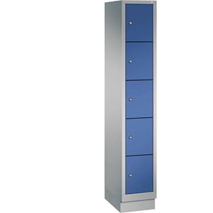 CLASSIC Fächerschrank mit Sockel, 1 Abteil, 5 Fächer, Abteilbreite 300 mm, weißaluminium / enzianblau. Anlieferung = montiert. Höhe = 1800 mm. Tiefe = 500 mm. Breite = 320 mm. Korpusfarbe = weißaluminium RAL 9006. Türfarbe = enzianblau RAL 5010. Verschlussart = Zylinderschloss verschiedenschließend. Anzahl Fächer = 5 Stück. Abteilbreite = 300 mm. Material = Stahlblech. Innenausstattung = ohne Innenausstattung. Innenbreite = 230 mm. Innenhöhe = 295 mm. Innentiefe = 465 mm. Türart = Flügeltür. Anzahl Schlüssel = 2 Stück. Fachhöhe = 320 mm. Fachbreite = 300 mm. Fachtiefe = 500 mm. Sockelhöhe = 100 mm. Konstruktion = verschweißt. Oberfläche = lackiert. Langlebige Stahlkonstruktion. Je Fach 1 Zylinderschloss mit je 2 Schlüsseln. 110° Türöffnungswinkel. Hochwertige Einbrennbeschichtung für hohe UV- und Korrosionsbeständigkeit. Sockel zurückgesetzt zum leichten Herantreten an den Schrank. Korpus aus stabiler Stahlkonstruktion mit hochwertiger Einbrennbeschichtung für hohe UV- und Korrosionsbeständigkeit. Auf 100 mm hohem Sockel, mit Kunststoffgleitern als praktischem Schrank- und Fußbodenschutz, vorne zurückgesetzt und oberhalb mit Luftdurchlass. Zylinderschlösser mit je 2 Schlüsseln, Schließkreis bis 1000 verschiedene Schließungen, Tür mit Anschlagsdämpfer, Türaufhängung oben und unten in Drehbolzen. Montierte Anlieferung.