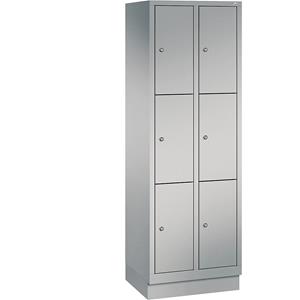 CLASSIC Fächerschrank mit Sockel, 2 Abteile, je 3 Fächer, Abteilbreite 300 mm, weißaluminium. Anlieferung = montiert. Höhe = 1800 mm. Tiefe = 500 mm. Breite = 610 mm. Korpusfarbe = weißaluminium RAL 9006. Türfarbe = weißaluminium RAL 9006. Verschlussart = Zylinderschloss verschiedenschließend. Anzahl Fächer = 6 Stück. Abteilbreite = 300 mm. Material = Stahlblech. Innenausstattung = ohne Innenausstattung. Innenbreite = 230 mm. Innenhöhe = 510 mm. Innentiefe = 465 mm. Türart = Flügeltür. Anzahl Schlüssel = 2 Stück. Fachhöhe = 540 mm. Fachbreite = 300 mm. Fachtiefe = 500 mm. Sockelhöhe = 100 mm. Konstruktion = verschweißt. Oberfläche = lackiert. Langlebige Stahlkonstruktion. Je Fach 1 Zylinderschloss mit je 2 Schlüsseln. 110° Türöffnungswinkel. Hochwertige Einbrennbeschichtung für hohe UV- und Korrosionsbeständigkeit. Sockel zurückgesetzt zum leichten Herantreten an den Schrank. Korpus aus stabiler Stahlkonstruktion mit hochwertiger Einbrennbeschichtung für hohe UV- und Korrosionsbeständigkeit. Auf 100 mm hohem Sockel, mit Kunststoffgleitern als praktischem Schrank- und Fußbodenschutz, vorne zurückgesetzt und oberhalb mit Luftdurchlass. Zylinderschlösser mit je 2 Schlüsseln, Schließkreis bis 1000 verschiedene Schließungen, Tür mit Anschlagsdämpfer, Türaufhängung oben und unten in Drehbolzen. Montierte Anlieferung.