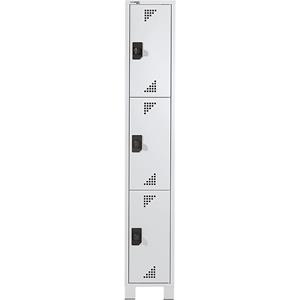 Schließfachschrank, Fachhöhe 558 mm, HxBxT 1800 x 300 x 500 mm, 3 Abteile, komplett lichtgrau. Anlieferung = montiert. Höhe = 1800 mm. Tiefe = 500 mm. Breite = 300 mm. Korpusfarbe = lichtgrau RAL 7035. Türfarbe = lichtgrau RAL 7035. Verschlussart = Sicherheitsdrehriegel für Vorhängeschloss. Anzahl Abteile = 3 Stück. Abteilbreite = 300 mm. Material = Stahlblech, punktgeschweißt. Abteilhöhe = 558 mm. Innenausstattung = ohne Ausstattung. Türart = Flügeltür. Konstruktion = punktgeschweißt. Oberfläche = einbrennlackiert. Integrierter Türöffnungsbegrenzer. Geschlossen lässt sich der Verschluss um 360° drehen - Aufbrechen durch Überdrehen ist nicht mehr möglich. Verzinkte Schrankfüße, 10 mm höhenverstellbar. Belüftung durch Lochbilder in den Türen und Rückwand. Stabile, punktgeschweißte Stahlblechkonstruktion, einbrennlackiert. Korpus immer lichtgrau RAL 7035. Mit einem in der Tür integrierten und in das Gehäuse einlaufenden Profil verstärkt. Öffnungswinkel 100°. Serienmäßig mit Sicherheitsdrehriegelverschluss (geeignet für Bügelschlösser Ø 6 - 8 mm). Belüftung durch Lochbilder in Türen und Rückwand. Ohne Mehrpreis auch mit 100 mm hohem Sockel lieferbar. Schrankfüße und Sockel bis 10 mm höhenverstellbar. Fachhöhe 558 mm. Montierte Anlieferung.