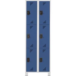 Schließfachschrank, Fachhöhe 558 mm, HxBxT 1800 x 600 x 500 mm, 6 Abteile, Korpus lichtgrau, Türen brillantblau. Anlieferung = montiert. Höhe = 1800 mm. Tiefe = 500 mm. Breite = 600 mm. Korpusfarbe = lichtgrau RAL 7035. Türfarbe = brillantblau RAL 5007. Verschlussart = Sicherheitsdrehriegel für Vorhängeschloss. Anzahl Abteile = 6 Stück. Abteilbreite = 300 mm. Material = Stahlblech, punktgeschweißt. Abteilhöhe = 558 mm. Innenausstattung = ohne Ausstattung. Türart = Flügeltür. Konstruktion = punktgeschweißt. Oberfläche = einbrennlackiert. Integrierter Türöffnungsbegrenzer. Geschlossen lässt sich der Verschluss um 360° drehen - Aufbrechen durch Überdrehen ist nicht mehr möglich. Verzinkte Schrankfüße, 10 mm höhenverstellbar. Belüftung durch Lochbilder in den Türen und Rückwand. Stabile, punktgeschweißte Stahlblechkonstruktion, einbrennlackiert. Korpus immer lichtgrau RAL 7035. Mit einem in der Tür integrierten und in das Gehäuse einlaufenden Profil verstärkt. Öffnungswinkel 100°. Serienmäßig mit Sicherheitsdrehriegelverschluss (geeignet für Bügelschlösser Ø 6 - 8 mm). Belüftung durch Lochbilder in Türen und Rückwand. Ohne Mehrpreis auch mit 100 mm hohem Sockel lieferbar. Schrankfüße und Sockel bis 10 mm höhenverstellbar. Fachhöhe 558 mm. Montierte Anlieferung.
