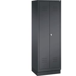 CLASSIC Garderobenschrank mit Sockel, zueinander schlagende Türen, 2 Abteile, Abteilbreite 300 mm, schwarzgrau. Anlieferung = montiert. Höhe = 1800 mm. Tiefe = 500 mm. Breite = 610 mm. Korpusfarbe = schwarzgrau RAL 7021. Türfarbe = schwarzgrau RAL 7021. Verschlussart = Drehriegel mit Vorrichtung für Vorhängeschloss. Anzahl Abteile = 2 Stück. Abteilbreite = 300 mm. Material = Stahlblech. Innenausstattung = 1 Ablageboden, 1 Garderobenstange mit 3 Schiebehaken. Innenbreite = 230 mm. Innenhöhe = 1600 mm. Innentiefe = 465 mm. Türart = Flügeltür. Sockelhöhe = 100 mm. Konstruktion = verschweißt. Oberfläche = lackiert. Langlebige Stahlkonstruktion. 110° Türöffnungswinkel. Hohe UV- und Korrosionsbeständigkeit. Sockel zurückgesetzt. Privat- und Berufsbekleidung getrennt, 2 Abteile für 1 Person, Türen zueinanderschlagend für gemeinsamen Verschluss. Korpus aus stabiler Stahlkonstruktion mit hochwertiger Einbrennbeschichtung, innen je Abteil 1 Ablageboden, darunter 1 stabile Garderobenstange aus Ovalprofil mit 3 verdrehsicheren Schiebehaken. Schrankboden hinten mit Lüftungsöffnungen für optimale Luftzirkulation, auf 100 mm hohem Sockel, mit Kunststoffgleitern als praktischem Schrank- und Fußbodenschutz, vorne zurückgesetzt und oberhalb mit Luftdurchlass. Drehriegel für Vorhängeschloss, Türen mit Anschlagsdämpfer und mittiger Verstärkung für hohe Stabilität, mit Lüftungsschlitzen oben und unten sowie eingestanztem Etikettenrahmen, Türaufhängung in Drehbolzen. Montierte Anlieferung.