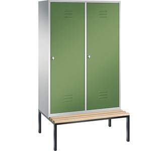 CLASSIC Garderobenschrank mit untergebauter Sitzbank, Tür über 2 Abteile, 4 Abteile, Abteilbreite 300 mm, lichtgrau / resedagrün. Anlieferung = montiert. Höhe = 2090 mm. Breite = 1190 mm. Tiefe = 815 mm. Korpusfarbe = lichtgrau RAL 7035. Türfarbe = resedagrün RAL 6011. Verschlussart = Drehriegel mit Vorrichtung für Vorhängeschloss. Anzahl Abteile = 4 Stück. Material = Stahlblech, lackiert. Abteilbreite = 300 mm. Abteiltiefe = 500 mm. Innenausstattung = je Abteil: 1 Ablageboden, 1 Kleiderstange mit 3 Schiebehaken, Mitteltrennwand. Sitzhöhe = 420 mm. Sitztiefe = 315 mm. Schranktiefe = 500 mm. Türart = Flügeltür. Leistenfarbe = Buche. Gestellfarbe = schwarzgrau RAL 7021. Ausführung = mit untergebauter Sitzbank. Serie = CLASSIC. Innenbreite = 2x230 mm. Innenhöhe = 1600 mm. Langlebige Stahlkonstruktion. 110° Türöffnungswinkel. Für Privat- und Berufsbekleidung, 1 Tür über 2 Abteile. Korpus aus stabiler Stahlkonstruktion mit hochwertiger Einbrennbeschichtung, innen je Abteil 1 Ablageboden darunter 1 stabile Garderobenstange aus Ovalprofil mit 3 verdrehsicheren Schiebehaken. Schrankboden hinten mit Lüftungsöffnungen für optimale Luftzirkulation, auf untergebauter Sitzbank, Gestell aus stabilem Vierkant-Stahlrohr 30 x 30 mm, mit verstellbaren Bodengleitern für einfachen Niveauausgleich. Drehriegel für Vorhängeschloss, Türen mit Anschlagsdämpfer und mittiger Verstärkung für hohe Stabilität, mit Lüftungsschlitzen oben und unten sowie eingestanztem Etikettenrahmen, Türaufhängung in Drehbolzen. Sitzleisten aus Buche-Hartholz, im Profil ca. 60 x 30 mm, allseitig gehobelt, oben abgerundet für guten Sitzkomfort, klarlackiert mit naturgegebenen Farbunterschieden. Montierte Anlieferung des Schrankes. Die Sitzbank wird separat geliefert - einfache Montage.