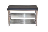 Moderne trendige Sitzbank aus Metall, mit einem festen, schaumstoffgepolsterten Sitzkissen, bezogen mit einem pflegeleichten, strapazierfähigen Kunstlederbezug (100% Polyvinylchlorid), schwarz. Stabiles Gestell aus Vierkantstahlr, verchromt. 2 Gitterablagen aus Stahlrohr, ebenfalls trendig verhromt. Auf den Gitterablagen lassen sich u. a. ca. 10 Paar Schuhe abstellen. Artikel wird zerlegt, mit Aufbauanleitung angeliefert. Maße ca. cm: B. 80 x H. 50 x T. 30 Weitere Hinweise Sitzbank mit gepolsterter Sitzfläche Stauraum für 10 Paar Schuhe Pflegeleichte Oberflächen