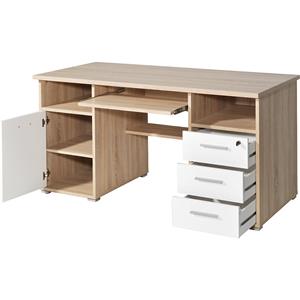 Schreibtisch mit große Arbeitsfläche, 1 Tastaturauszug, 2 Ablagefächer, 1 Ablageboden, 1 Tür - dahinter 1 Boden, 3 Schubkästen - davon 1 abschließbar, Metallgriffe; im Dekor Eichefb./Weiß mit Touchwood Oberfläche. In folgenden Farben erhältlich:: Korpus/Front: Anthrazit, Korpus/Front: Walnussfb.-Schwarz, Korpus/Front: Eichefb.-Weiß, Farbe Griffe: alufarben, Farbe Füße: alufarben. Details:: Rückwand im Holzdekor - dadurch frei im Raum stellbar, 1 Tür, 3 Schubkästen, Schubkasteninnenmaße (B/T/H): ca. 34/31,5/12 cm, 1 Schubkasten abschließbar, Laufleisten der Schubkästen aus Metall, 2 Fächer, 1 verstellbarer Einlegeboden, 1 fester Boden, Maße Tastaturauszug (B/T/H): 58/34/1,8 cm, Maße der offenen Fächer (B/T/H): 37/61/18 cm, Fachmaße hinter der Tür (B/T/H): 37/59/ 48 cm, Höhe von Tastaturauszug zur Tischplatte: 8 cm, Maße Ablageboden (B/T): 61/25, Abstand Ablage zum Boden: 35 cm, Abstand Ablage zur Tischplatte: 26 cm, Schreibtischplatte mit ABS-Kante, Platzsparend, Pflegeleichte Oberfläche, Metallgriffe, Mit Füßen, Höhe der Füße: 2 cm, Made in Germany. Tischplattenhöhe:: 75 cm. Gesamtmaße:: Gesamtmaße (B/T/H): 145/70/75 cm. Material:: Korpus: Holzwerkstoff, Front: Holzwerkstoff, Griffe, Scharniere und Laufleisten aus Metall, Füße aus Kunststoff. Informationen zu Lieferumfang und Montage:: Selbstmontage mit Aufbauanleitung, Alles ca.-Maße (inkl. Fußhöhe). Pflegehinweise:: Pflegehinweise für Möbel aus Holzwerkstoffen (inklusive Melamin und MDF): Verwenden Sie zur Pflege Ihrer Möbel aus Plattenwerkstoffen am besten ein weiches, nicht fusselndes Tuch oder ein Ledertuch. Wischen Sie die Oberflächen leicht feucht ab. .