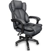 Chefsessel im edlen Design mit Fußstütze, extra Polsterungen und Relaxposition Flexibler Chefsessel im markenten und doch edlen Lederoptik-Design. Dieser Bürostuhl ist mit flexiblen, gepolsterten 3-Punkt-Armlehnen ausgestattet. Er kann in eine Relaxposition (siehe Animation links) eingestellt werden und die Armlehnen passen sich der Position mit an. Für die beste Entspannung kann die gepolsterte Fußstütze einfach ausgezogen werden. Der Drehstuhl verfügt über zwei Einstellhebel. Mit einem Hebel lässt sich die Sitzhöhe einstellen und mit dem anderen Hebel kann die Rückenlehnenposition eingestellt werden. Spezifikationen geschwungene Design-Armlehnen mit Polsterung weiche Sitzhöhenverstellung dank Gasdruckfederlift verstellbare Rückenlehne mit Relaxposition extra Polsterungen für einen besseren Sitzkomfort integrierte Kopfstütze mit weicher Polsterung gepolsterte ausziehbare Fußstützte Sicherheitsfußkreuz mit flexiblen Doppelrollen pflegeleichte Kunstlederoberfläche kompakte Lieferung