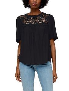 Gut kombinierbare Damen-Kurzarmbluse der Marke QS. Mit einem hüftlangen und normalen Schnitt. Außerdem hat die Bluse einen Verschluss hinten mit einem Knopf. Sie ist mit raffinierter und modischer Stickerei versehen. Das Oberteil beteht aus angenehm weicher Viskosemischung.