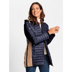 Kontraststark und winterlich wärmend präsentiert sich die wattierte Longjacke in horizontaler Steppung. Durch Reißverschluss abnehmbare Kapuze mit Tunnelzug, Stehkragen und 2-Wege-Reißverschluss. 2 Reißverschluss-Taschen und 1 knöpfbare Innentasche. Die Kontrast-Einsätze seitlich mit Ripsband-Verzierung wirken optisch streckend. Elastisches Ärmelbündchen. Metall-Element mit Glitzerschmuck an einem Ärmel. Hinten etwas länger und mit abgerundetem Saum. 100% Polyamid. Einsatz: 92% Polyester, 8% Elasthan. Futter: 100% Polyamid. Maschinenwäsche.
