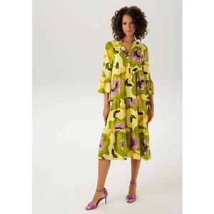 Verspieltes Kleid von Aniston CASUAL. Großflächiger, graphischer Blumendruck - jedes Teil ein Unikat. Volant an den 3/4-langen Ärmeln und am Saum. Dekorativer V-Ausschnitt und kurze Knopfleiste. Lässig geschnittenes, knieumspielendes Blusenkleid. Länge in Gr. 36 ca. 110 cm. Aus weich fallender Viskose. Maschinenwäsche.