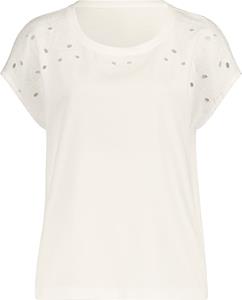 Rundhals-Shirt mit hübscher Lochstickerei am Ausschnitt und an den überschnittenen Schultern. 100% Baumwolle. Maschinenwäsche.
