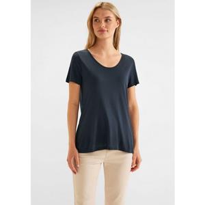 Auf der Suche nach einem neuen Oberteil℃ Das T-Shirt von STREET ONE macht alles möglich — ob dezent, cool oder peppig. Dieses Shirt hat einen V-Ausschnitt mit Strickbund und ist hüftbedeckend sowie locker geschnitten, sodass der Oberkörper locker betont wird. Das Oberteil hat Seitenschlitze, die dir mehr Bewegungsfreiheit bieten. Der Jerseystoff aus Viskose ist dehnbar und fühlt sich geschmeidig auf der Haut an. Die Grundlage aller guten Outfits In der Freizeit können zum Shirt lässige Shorts im Used-Look oder ein Minirock kombiniert werden. Vervollständigt wird der Look mit einer bunten Strickjacke oder einer Long-Weste. Auch sportlich kann das Shirt kombiniert werden. Dafür einfach eine bequeme Jogginghose wählen und das Outfit mit weißen Sneakern vervollständigen. In Sachen Styling machst du mit diesem Shirt von STREET ONE nichts verkehrt!