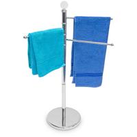 Dieser Handtuchständer bietet viel Platz für Ihre nassen Badetücher. Durch die 3 schwenkbaren Handtuchstangen können diese trocknen, ohne sich dabei zu berühren. Die drehbaren Arme bieten ebenfalls den Vorteil, sie geschlossen an der Wand auszurichten und den Handtuchhalter so platzsparend zu stellen. Das glänzende Material aus verchromtem Metall in Edelstahl-Optik wirkt modern und elegant und fügt sich stilvoll in jede Badeinrichtung ein. Durch den verdeckten Standsockel aus Hartplaste steht der Badetuchständer zudem auch auf Fliesen rutschfest und ist schonend zum Fußboden. Details des Handtuchständers mit 3 beweglichen Armen • Höhe: ca. 95 cm • Durchmesser Standfuß: ca.29 cm • Handtuchstange: ca. 33 cm • Max.-Breite: ca. 70 cm • Gewicht: ca. 3,7 Kg Schöner großer Standhandtuchhalter • Fügt sich dezent und elegant in jedes Badezimmer • Stylische Chromkugeln am Ende der Metallstangen • Standsockel aus stabilem Hartplaste • Keine Schrammen auf dem Untergrund • Rutschfester Stand auf
