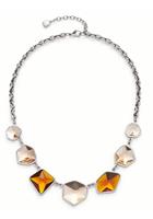Mit Ecken und Kanten! Dieses Collier weiß seine Trägerin in den Mittelpunkt zu setzen. Plakativ geformte Glaskristalle in Brauntönen, die wie aus der Rohform herausgebrochen sind, heben sich mit natürlicher Schönheit und Extravaganz hervor. Das opulente Statement der Kristallglassteine wird von kräftigen Kettengliedern stilvoll unterstrichen.
