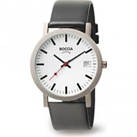 klassische Herrenuhr aus Reintitan, hautfreundlich und antiallergisch, 3-Zeiger-Quarzwerk, Datumsanzeige, weißes Zifferblatt, schwarze Zeiger und Indizes, zentraler roter Sekundenzeiger, satiniertes Titangehäuse, unempfindliches Mineralglas, Armband aus glattem schwarzem Leder mit 2 Schlaufen, matte Dornschließe, wasserdicht bis 5 bar, Durchmesser 38 mm, Höhe 7 mm