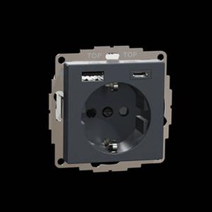 Schutzkontakt Steckdose Integrierter erhöhter Berührungsschutz gemäß VDE 0620 Teil 1. USB 2.0 Spannungsversorgung mit zwei Ausgängen zum gleichzeitigen Betreiben/Laden von zwei USB-Geräten mit integriertem Akku. Mit Krallen- und Schraubbefestigung. Mit Steckklemmen. Netzspannung. Nennspannung AC 100-240 V, 50-60 Hz. Eigenverbrauch < 0,15 W. USB Ausgänge. Ausgangsspannung DC 5 V +/- 10 %. Nennausgangsstrom 3000 mA (für beide Ausgänge zusammen). Material Thermoplast edelmatt. Farbe anthrazit.