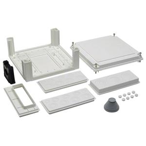Kabelanschlusskasten, univers, 324x307x149mm, IP54, SKII, unten leer. Kabelanschlusskasten als Einspeisegehäuse für Zähler und Verteilerschränke IP31/44/54 mit 160 mm oder 205mm Tiefe. Bestehend aus Gehäuse mit Deckel aus Kunststoff, bestückt mit Sammelschienenträger oder leer für optionale Bestückung mit Klemmen oder Montageplatte. Kabeleinführung durch herausnehmbare Flanschplatten an jeder Seite, zum Einlegen des Kabels von vorne. Anbaumöglichkeit seitlich oder unten. Deckel plombierbar. Zur Einspeisung bis 95qmm auf Klemmen oder bis 150qmm auf Sammelschienensystem 40mm-12x5/10mm mit 25kA Kurzschlussfestigkeit oder 60mm-12 bis 30x5/10mm mit max. 55kA Kurzschlussfestigkeit. Schutzart IP54, Schutzklasse II schutzisoliert, Bemessungsspannung 230/400V/50Hz.