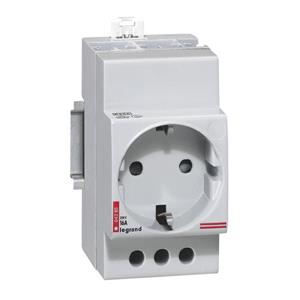 Legrand Verteilereinbausteckdose, Deutscher Standard, 10/16A 250 V AC, 2p+E, mit Schraubanschlussklemmen, mit erhöhtem Berührungsschutz, 2-5-modulig, Befestigung auf Hutprofilschiene EN 60715 durch rastende Schnellbefestigung.