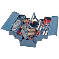 Mit fünf Einzelfächern bietet dieser Werkzeugkasten die Möglichkeit, Werkzeuge gut sortiert aufzubewahren. Für den robusten Einsatz eignet sich das Produkt durch die Herstellung aus Stahlblech mit einer Stärke von 0,6 mm. Unempfindlich gegen mechanische Belastungen ist es durch die sowohl innen als auch außen aufgebrachte blaue Hammerschlaglackierung. Einfach zu betätigen ist der Werkzeugkasten, indem zum öffnen lediglich die kräftig ausgeführten Nietscharniere auseinandergeklappt werden müssen. So hat der Anwender gleich freien Blick auf alle Fächer. Zum Verschließen muss nur der umlegbare Tragebügel nach oben gezogen werden. Zum Schutz vor Diebstahl kann der Werkzeugkasten durch ein Vorhangschloss gesichert werden.Das Vorhangschloss ist nicht im Lieferumfang enthalten! Die Lieferung erfolgt ohne Inhalt!