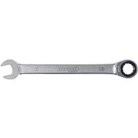 Maulschlüssel mit Ringratsche, FORMAT Ausführung: Aus Chrom-Vanadium-Stahl. Verchromt, gerade Form, mit griffig geprägtem Profilschaft. Exakt verzahnter Ratschenmechanismus mit 72 Zähnen und einem Rückstellwinkel von 5°. Maulstellung 15°. Die Drehmomente übertreffen die Vorgaben nach DIN 3110, ISO 3318. weitere Info's Schlüsselweite: 18 mm Länge: 236 mm Maulstärke: 7,7 mm Ringstärke: 10,7 mm