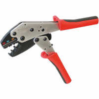 Crimpzange für isolierte Kabelschuhe, Format, mit Hebelübersetzung Ausführung: Zangenkörper aus Stahl, Zwangssperre garantiert Qualitätscrimp. Entriegelungsmöglichkeit bei evtl. Fehlbedienung. Griffe mit Kunststoffhüllen. Mit drei Crimpzonen. Anwendung: Zum Verpressen von PVC- und Polyamid-isolierten Verbindern (Kabelschuhe, Stiftkabelschuhe, Parallel- und Serienverbinder sowie Steckverbinder). Für isolierte Kabelschuhe. weitere Info's Leiterquerschnitt: 0,5-6 mm² Verarbeitung: von der Seite Länge: 235 mm
