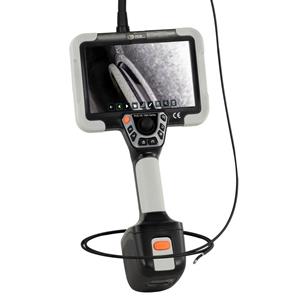 Dieses Digitalendoskop ist als einziges Gerät der Serie PCE-VE 1500 mit zwei Kameras ausgestattet. Eine davon ist frontal ausgerichtet, die andere seitlich. Beide sind am Kamerakopf sehr dicht nebeneinander positioniert. Neben jeder der Kameras ist eine LED angeordnet, mit der das Blickfeld bei Bedarf beleuchtet werden kann. Einstellungen am Endoskop für die Bilddarstellung auf dem Display und für die Beleuchtung des Kamerablickfeldes werden jeweils für beide Kameras und beide Lichtquellen gleichzeitig wirksam. Der Nutzer kann jederzeit wählen, ob das Digitalendoskop das aktuelle Bild der Frontkamera, das der Seitenkamera oder beide nebeneinander auf dem großen Display des Touchscreens anzeigt. Die gleichzeitige Anzeige beider Kameras erleichtert die Orientierung während der visuellen Inspektion deutlich. Zudem ist es gerade bei sehr beengten Platzverhältnissen vorteilhaft, sowohl die Front- als auch die Seitenkamera nutzen zu können.Bilder und Videos können aber nicht parallel mit beiden Kameras aufgenommen. Bei Aufnahmen in dem Betrachtungsmodus, in dem beide Kameras zu sehen sind, werden vom Endoskop nur die Bilder der aktivierten Kamera gespeichert. Wenn der Anwender Bildbeschriftungen aktiviert hat, dann erscheinen diese nur auf dem Bild der aktivierten Kamera. Standardmäßig bietet das Digitalendoskop unter dem Menüpunkt Wasserzeichen zum Beispiel Einblendungen wie Datum und Uhrzeit oder die Kamerabezeichnung als CAM1 bzw. CAM2 an. Die ausgew