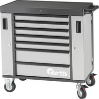 Werkstattwagen ● Stabile Stahlblechkonstruktion ● Oberfläche pulverbeschichtet ● Arbeitsplattform mit geriffelter, 10 mm starker Schaummatte ● 2 Laufrollen und 2 Lenkrollen mit Feststeller ● Schubfächer einseitig ausziehbar ● Es lässt sich jeweils nur eine Schublade öffnen ● Vollauszug ● Jede Schublade verfügt über eine 2,5 mm starke Schutzmatte, zum Schutz des Schubladenbodens ● Kugelgelagerte Führungsschienen ● Beidseitige, gasfederbelastete Türen ● Beide Stirnseiten mit 4-kant-Lochung ● Zentralverriegelung durch Zylinderschloss Lieferung: Inklusive 3 Sichtlagerkästen. weitere Info's: Gesamtmaße L x B x H: 910 x 475 x 1000 mm Schubladenanzahl: 7 Schubfachlänge: 568 mm Schubfachtiefe: 5 x 75 und 2 x 154 mm Schubfachbreite: 398 mm Schubfachbelastung: 40 kg Tragkraft statisch: 550 kg Marke: FORTIS
