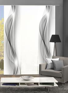 "NEBLANA" 3ER SET DIGITALDRUCK DEKOSTOFF-SEIDENOPTIK, bestehend aus 2 digitalbedruckten Schiebevorhängen aus blickdichtem Dekostoff-Seidenoptik sowie 1 blickdichtem Uni aus Dekostoff-Seidenoptik. Die Schiebevorhänge werden inkl. Zubehör geliefert: Oben zur Befestigung einen Kunststoff-Paneelwagen inkl. Röllchen und X-Gleiter (auch IKEA) sowie als Abschluss eine Aluminium-Klemmleiste als Beschwerungselement. Jeder einzelne Schiebevorhang ist 245 cm hoch und kann auf jede beliebige Höhe gekürzt werden. Dazu einfach die Klemmleiste abmachen, auf der entsprechenden Höhe gerade abschneiden und Klemmleiste wieder anbringen. Stoff aus 100% Polyester. Waschbar bei 30°C - Schonwaschgang - Zubehör dazu einfach abmachen - nicht im Trockner trocknen - keine chemische Reinigung möglich