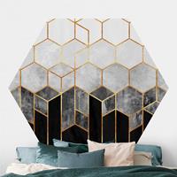 Material:- 150 g/m² Vliestapete Selbstklebend matt- bis Größe 150 x 130 cm in einer Bahn, ab Größe 152 x 175 cm in zwei BahnenEigenschaften:- Glatte Oberfläche- Dimensionsstabil und rissüberbrückend- Abziehbar und repositionierbar- Unempfindlich bei Temperaturschwankungen- Resistent gegenüber Luftfeuchtigkeit- Spritzwasserbeständige Beschichtung- Frei von PVC, Weichmachern und Lösemitteln- In ganzen Bahnen ablösbar und sogar wiederverwendbarDruck:- Umweltfreundlicher Latexdruck- Brillante Druckfarben- Sonnenlichtresistenter Druck, kein Ausbleichen- Zertifizierte DrucktinteUntergrund & Anbringung:- Haftet nicht auf: Grundputz, Glattputzuntergrund, Rauputzuntergrund und grober Raufasertapete- Der Untergrund muss frei von Schmutz, Staub, silikon- & ölhaltigen Farben und Latexfarbe sein- Bei frisch gestrichenen Wänden sollten Sie mindestens 3 Wochen wartenLieferumfang:- Vliestapete gerollt- Fertig in Hexagon Form zugeschnitten- Montageanleitung- Sicher verpacktMontageanleitung:- Einbahnig: Abziehen und ankleben, auf eine korrekte Motivausrichtung achten. Mit der Andruckrolle stark andrücken und eventuelle Blasen von der Mitte zur Seite rausrollen.- Zweibahnig (zu zweit anbringen): Vertikale Mittellinie anzeichnen, die Tapete oben an der Linie ansetzen und ankleben. Das Rückpapier langsam nach unten abziehen und gleichzeitig mit der Andruckrolle stark von der Mitte nach außen rollen.